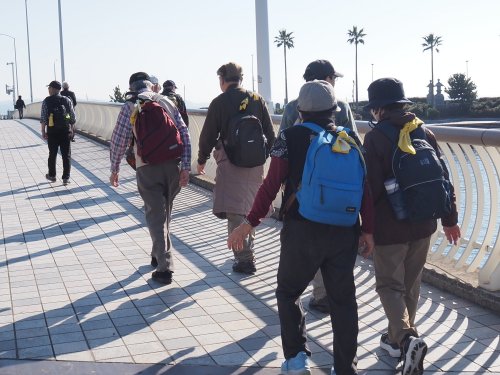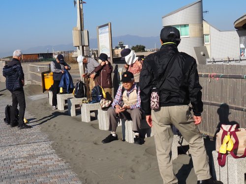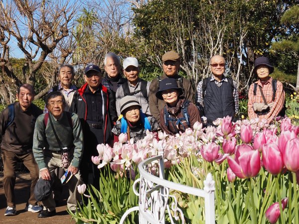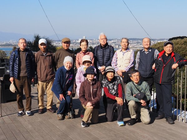 <第201回 2026年 1月 鵠沼海岸を歩き江ノ島散策>Tkhsさんの紀行文です。浜見山公園に9:00集合。 OT、TMさんのお二人は往路バス利用し現地で合流するとの報告有り、お二人を加え参加者は総勢13名。 まずは出発前にOGさんのリードで“おはよう体操”で体をほぐし江ノ島に向け出発。 辻堂海浜公園を抜け、海岸遊歩道へ。 今日は風もなく気温も3月の陽気とのことで、ウォーキングには最適の条件。 途中、“鵠沼海岸サーフビレッジ”と“えのすいクラゲ広場”で休憩を取り、予定通りの時間にエスカー乗り場に到着。 3つのエスカーを乗り継ぎ“辺津宮”と“中津宮”で参拝し、目的地の“サムエル・コッキング苑”に到着。 苑内を散策し今季が見納めのウインターチュリップ(来シーズンは春頃に時期をずらすとのこと)の前で集合写真撮影。 撮影後、シーキャンドルのサンセットテラスへ、テーブル・椅子はほとんど空いており、ゆったり座って、お待ちかねの昼食タイム。 昼食中、漸くOT、TMさんが合流し、食後、全員揃った所で、再度集合写真撮影。 苑内自由散策の時間を30分ほど取り、帰路は、“御岩屋道通り”の“山ふたつ”を経由し島内西側の小径を歩き江の島バス停へ。 ここからバスを乗り継ぎ14:00にニューライフ到着し無事解散。 本日のウォーキングは約14,000歩でした。 データ ・参加者 13名 (男性8名、女性5名) ・日時 2026年1月16日(金) ・集合場所 浜見山公園 ・集合時間 午前9時 ・コース 浜見山公園9:10出発 ~ 鵠沼海岸サーフビレッジ ~ えのすいクラゲ広場 ~ エスカー乗り場11:00着(エスカー1)→ 辺津宮(エスカー2)→ 中津宮(エスカー3)→ サムエル・コッキング苑(昼食と散策)11:30着 12:30発 ~ 江の島バス停13:00発 → 藤沢駅南口バス停13:15着(一次解散)~ 藤沢駅北口バス停13:20発 → 浜見山バス停 → ニューライフ14:00(解散) ・持ち物 昼食、飲み物、雨具、杖等 ・費用 交通費 540円 浜見山公園に集合、時間前の談笑。 集合後全員で「ピンコロ・おはよう体操」をして歩行の準備をする |